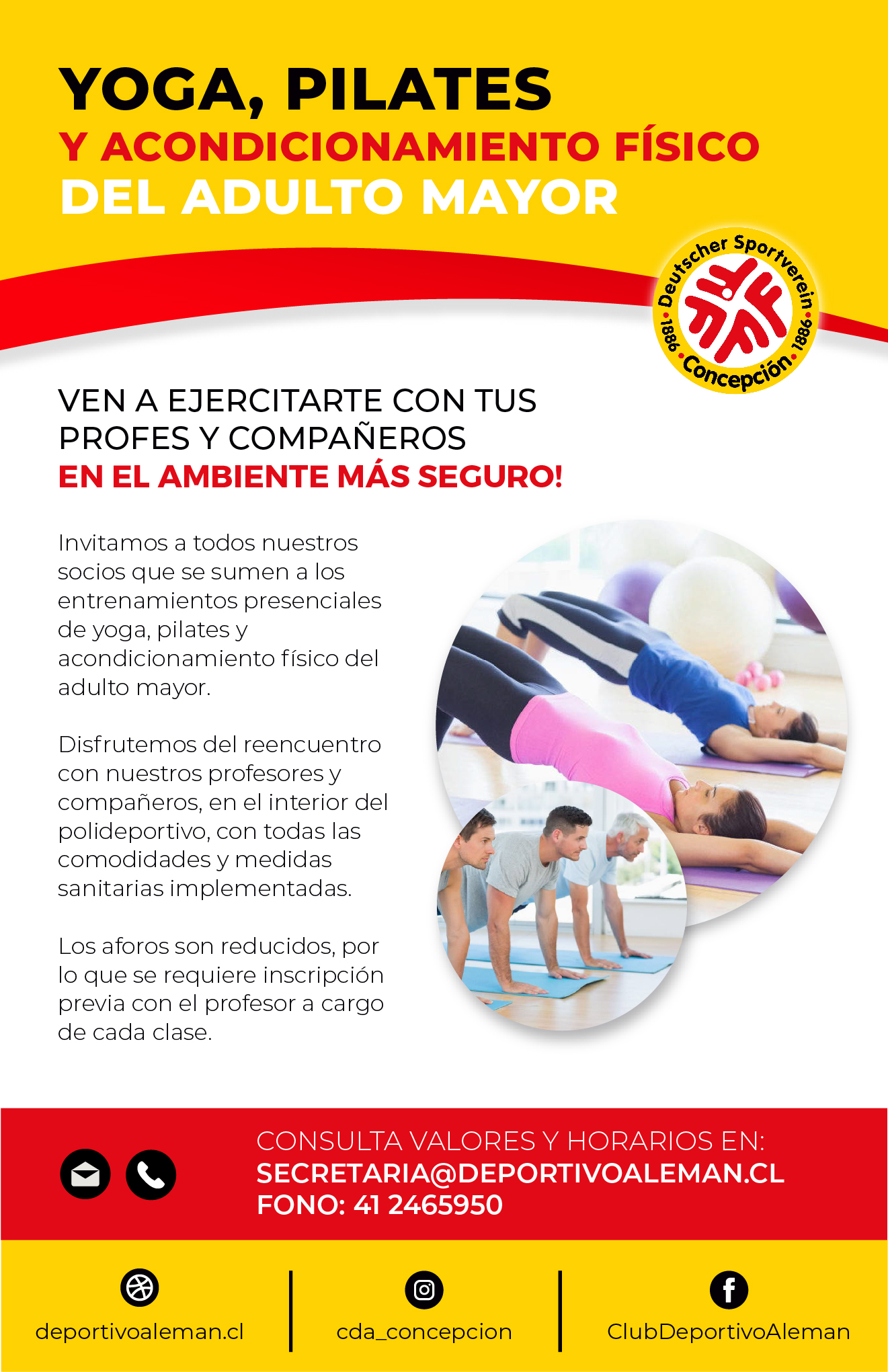Hoy estamos en condiciones de ofrecer clases presenciales a nuestros socios, al interior de nuestro polideportivo. Nuestras tradicionales clases de yoga, pilates y acondicionamiento físico del adulto mayor, entregan todas
