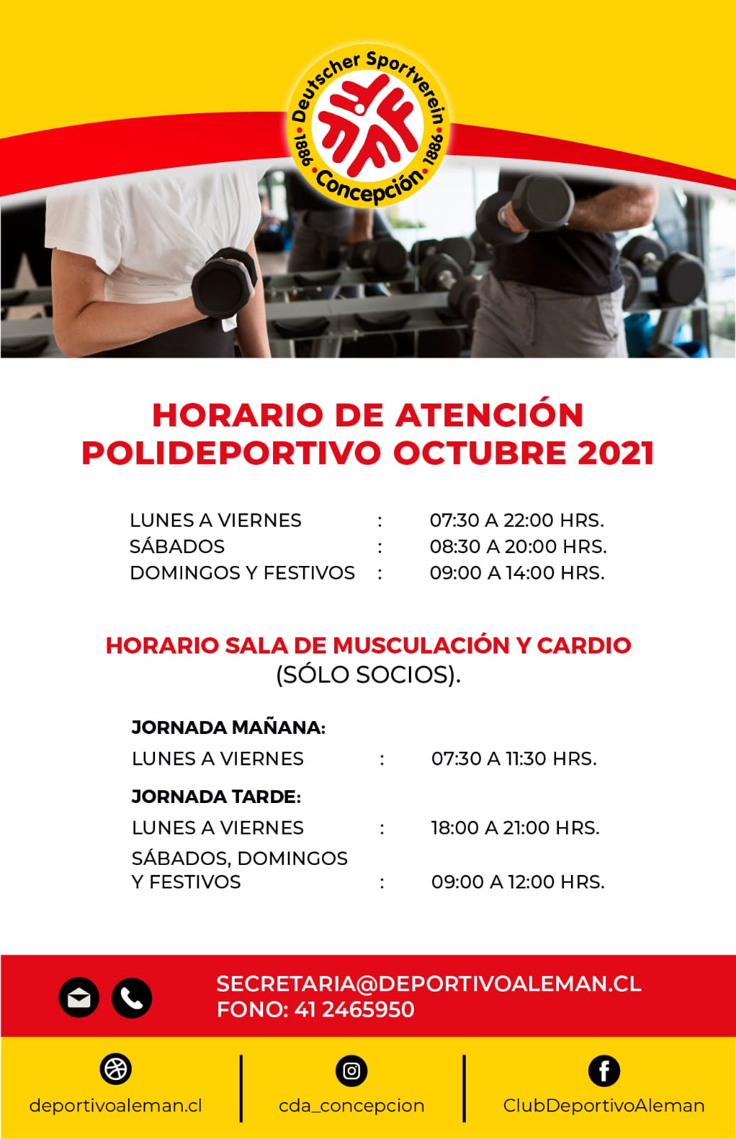 Desde este domingo 08 de agosto, podrás venir a ejercitarte a la sala de musculación en jornada am. Tendremos 2 turnos: TURNO 1: 09:10 a 10:50 hrs. TURNO 2: 11:00